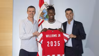 El extremo internacional español del Athletic Club Nico Williams ha firmado este martes en San Mamés su nuevo contrato, con el que ha renovado su vínculo con el equipo rojiblanco hasta el 30 de junio de 2035, ocho años más que en su anterior acuerdo, lo que lo convierte en el más largo de la primera plantilla.