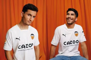 Hugo Guillamón y Carlos Soler con la nueva primera equipación del Valencia CF para la temporada 2022/23 - PUMA