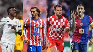 Los jugadores Vinícius Junior (Real Madrid), Antoine Griezmann (Atlético de Madrid), Cristhian Stuani (Girona) y Raphinha (FC Barcelona). - EUROPA PRESS