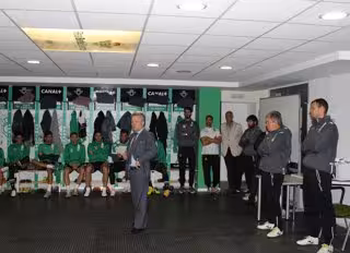 El nuevo presidente y su antecesor en el cargo, Miguel Guillén, se reunieron esta mañana en el vestuario con los futbolistas y el cuerpo técnico, el primero para despedirse y Domínguez Platas para tomar el relevo.