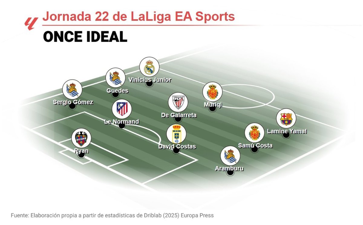 Once ideal de EP Deportes de la jornada 22 de LaLiga EA Sports 2025-26. - EPDATA