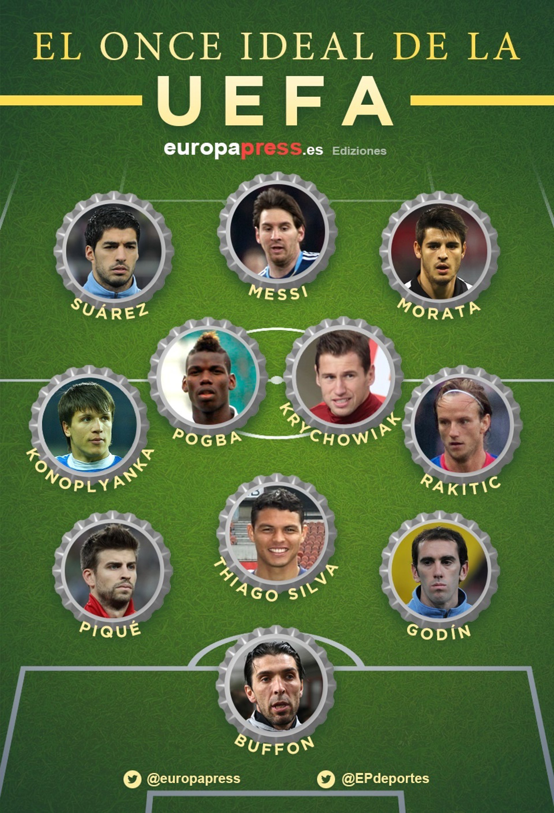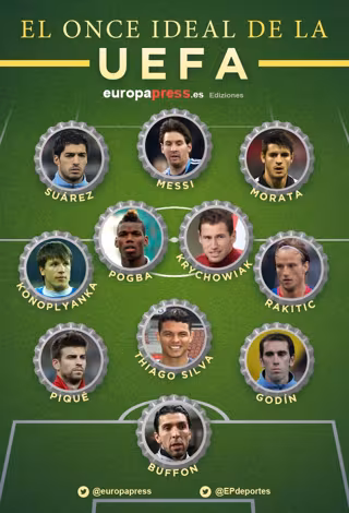 El pasado martes, UEFA abrió el periodo de votación al 11 ideal de la UEFA del 2015. Este once ideal se puede conformar escogiendo entre 40 candidatos, jugadores de fútbol de altísimo nivel. Cualquier usuario de la web ww.uefa.com podrá hacer su propia alineación ideal del año. Europa Press ha votado y elegido su propio once y el esquema de juego, un 3-4-3. Os lo presentamos aquí y además, con una breve explicación de los motivos por los cuales han sido elegidos cada uno de ellos.