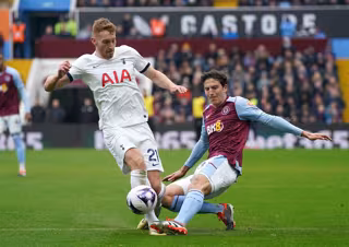 10 March 2024, United Kingdom, Birmingham: Tottenham Hotspur's Dejan Kulusevski (L) and Aston Villa's Pau Torres battle for the ball during the English Premier League soccer match between Aston Villa and Tottenham Hotspur at the Villa Park. Photo: Nick - Nick Potts/Press Association/dpa