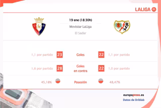 De media, Osasuna ha encajado 1,5 goles y 8,3 tiros por partido ante los 1,2 goles y 11,6 remates que recibe el Rayo.