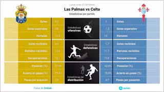 En el panorama ofensivo, el Celta de Vigo tiene mejores números que Las Palmas en goles por partido, con 1 goles por encuentro del primero frente a 0,3 del segundo. En cuanto a la calidad de las ocasiones de gol generadas, Las Palmas también supera al Celta de Vigo con 0,8 goles esperados frente a 1,3. según las estadísticas de Driblab consultadas por Europa Press.