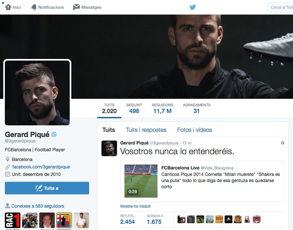 "Vosotros nunca lo entenderéis", escribió únicamente Piqué para enlazar un vídeo publicado por otro usuario de Twitter con imágenes del canal Esport 3 en el que se mostraban los insultos recibidos por Piqué, dirigidos a su pareja y a su hijo, en el derbi de Liga del 29 de marzo de 2014 en Cornellà que acabó con victoria blaugrana (0-1).