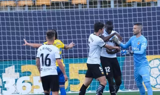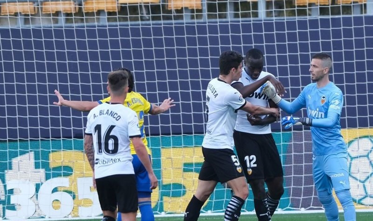 Lo deportivo quedó en segundo plano en el Ramón de Carranza, aunque la victoria en un cabezazo de Marcos Mauro en el minuto 88 permite a los de Álvaro Cervera dar un paso de gigante por la salvación y el Valencia sigue su viacrucis. A la media hora de partido se paró el balón por el pique entre Diakhaby y Cala, que llevó al francés a salir del campo y detrás todos sus compañeros.
