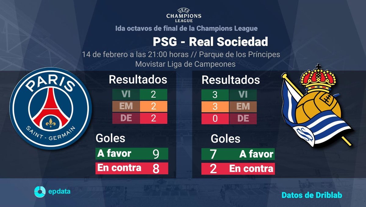 Gráfico con el estado del Paris Saint Germain y la Real Sociedad en la Champions League, con marcador y goles hasta su próximo enfrentamiento el 14 de febrero de 2024. - Europa Press