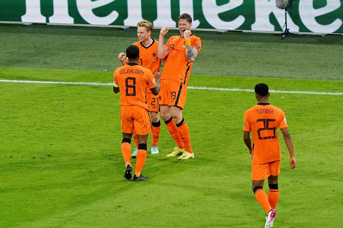 Wout Weghorst of the Netherlands celebrates with Frenkie de Jong and Georginio Wijnaldum of the Netherlands after scoring his sides second goal during the UEFA Euro 2020, Group C football match between Netherlands and Ukraine - Andre Weening/Orange Pictures /AFP7/Europa Press