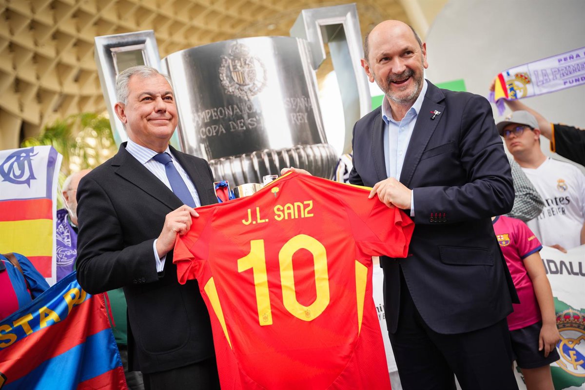El mandatario gallego entregó una réplica del trofeo copero y una camiseta personalizada de la selección española al alcalde sevillano, que invitó a todos los seguidores desplazados a la capital andaluza "a disfrutar de un partido único en una ciudad única del mundo".