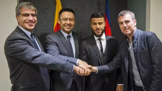 El jugador del FC Barcelona Rafa Alcántara 'Rafinha' ha firmado este lunes la renovación y mejora de su contrato que se anunció el pasado 2 de noviembre y lo ha hecho acompañado por el presidente del club, Josep Maria Bartomeu, un par de días después de que sus compañeros ganaran el Clásico, en una firma que le deja "muy feliz" por poder seguir en su casa hasta 2020 y con una nueva cláusula de rescisión de 75 millones de euros.