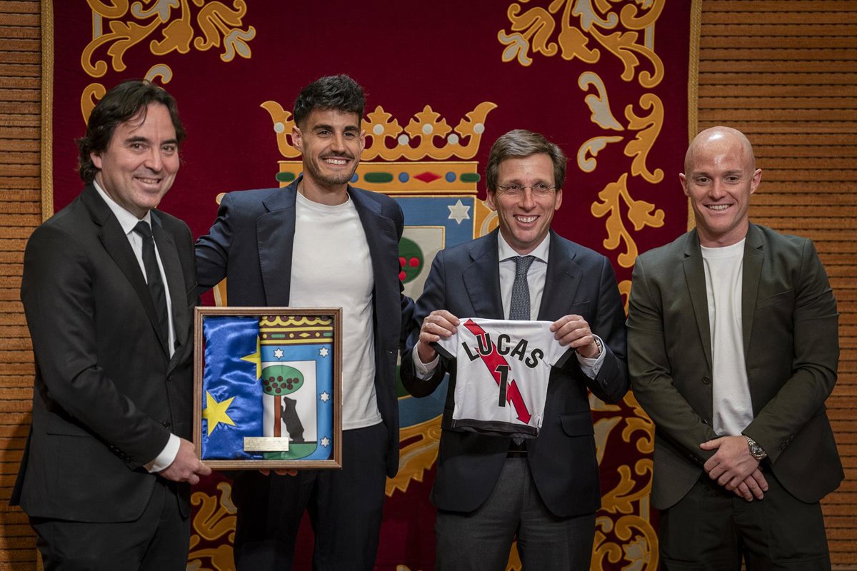 La delegación rayista, comandada por su presidente, Raúl Martín Presa, y los capitanes Óscar Valentín e Isi Palazón, obsequió al alcalde con una camiseta con el nombre de Lucas, el nombre del futuro hijo de Almeida.