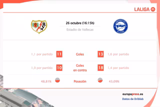 El Rayo Vallecano se enfrenta en la jornada 11 de LaLiga EA Sports como local ante el Alavés este sábado a las 16.15 (DAZN), un enfrentamiento al que llega tras haber perdido ante el Mallorca, no consiguiendo sumar ni un punto a los 13 que lleva en la competición. Por su parte, su adversario esta jornada, el Alavés, registra 10 puntos tras perder contra el Valladolid en la pasada jornada.