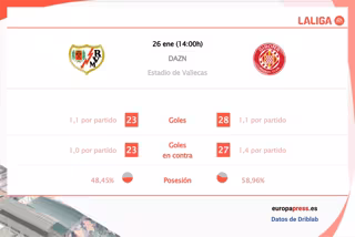 De media, el Rayo Vallecano ha encajado 1,2 goles y 11,4 remates por partido frente a los 1,4 goles y 9,5 disparos que recibe el Girona.