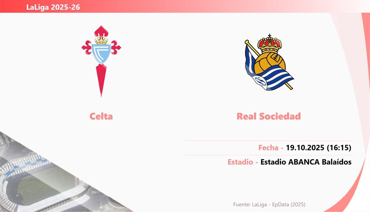 El partido que enfrenta a RC Celta y Real Sociedad de la jornada 9 de LaLiga EA Sports 2025-26 se disputará el domingo 19 de octubre a las 16.15 horas en el Movistar LaLiga.
