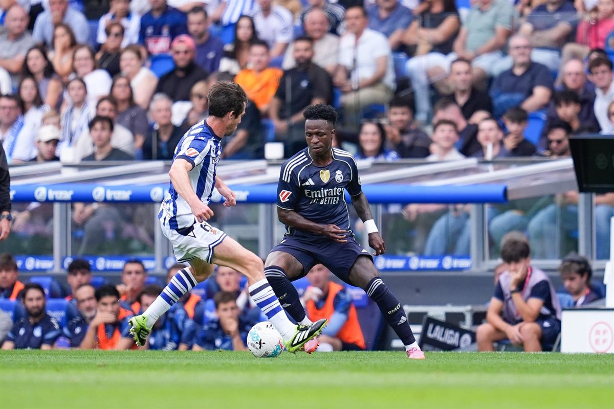 Archivo - El brasileño Vinícius Júnior (Real Madrid CF) intenta regatear a Aritz Elustondo en el partido de LaLiga EA Sports 2025-26 disputado en Anoeta. - Dennis Agyeman / AFP7 / Europa Press - Archivo