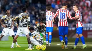 A la izquierda, Aurélien Tchouaméni, Arda Güler y Vinícius Júnior calientan con el Real Madrid; y a la derecha, Marc Pubill y Antoine Griezmann (Atlético de Madrid). - EUROPA PRESS