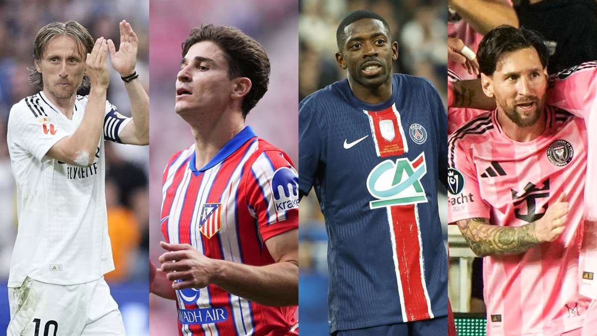 Luka Modric (Real Madrid), Julián Álvarez (Atlético de Madrid), Ousmane Dembélé (PSG) y Leo Messi (Inter Miami). - EUROPA PRESS / DPA