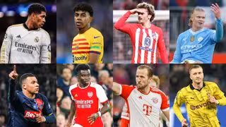 Los futbolistas Jude Bellingham (Real Madrid), Lamine Yamal (FC Barcelona), Antoine Griezmann (Atlético de Madrid), Erling Haaland (Manchester City), Kylian Mbappé (PSG), Bukayo Saka (Arsenal), Harry Kane (Bayern) y Marco Reus (Borussia Dortmund). - EUROPA PRESS / DPA