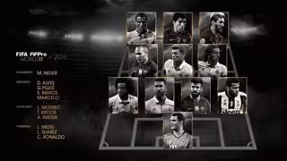 La alineación completa, anunciada este lunes durante la gala del premio The Best, está formada por Manuel Neuer como portero; Dani Alves, Gerard Piqué, Sergio Ramos y Marcelo como defensas; Luka Modric, Toni Kroos y Andrés Iniesta como centrocampistas; y Leo Messi, Luis Suárez y Cristiano Ronaldo como delanteros.
