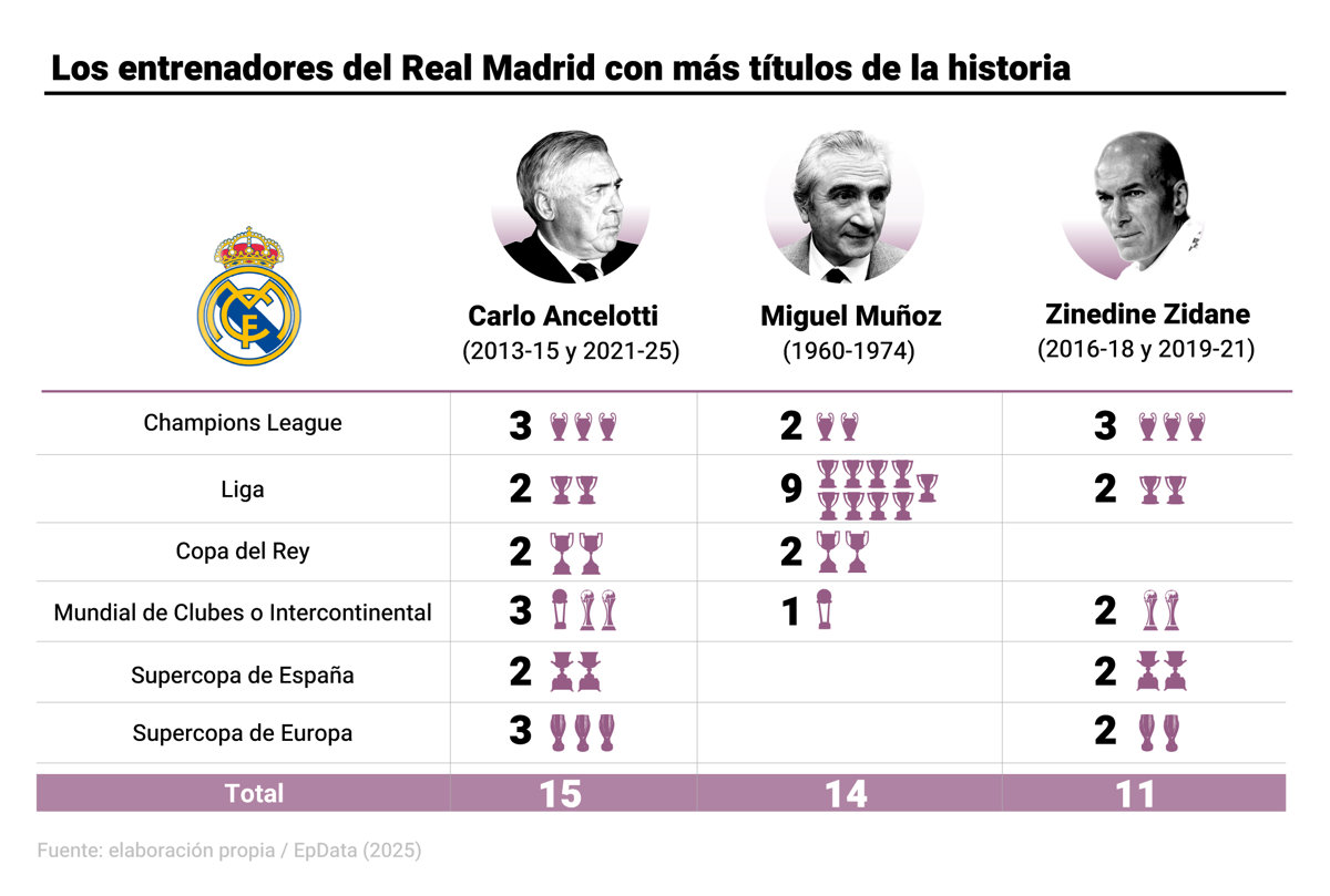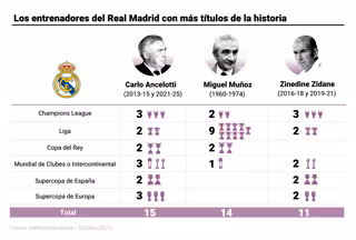 Desde ese 2021, ha levantado dos Champions, dos Ligas, una Copa del Rey, dos Supercopas de España, dos Supercopa de Europa, un Mundial de Clubes y una Copa Intercontinental. Un total de 11 títulos para ponerse en lo más alto de la historia del club a nivel de entrenadores, superando al mítico Miguel Muñoz, habiendo alcanzado además los 350 partidos, con un balance de 247 victorias, 50 empates y 53 derrotas, números que tratará de agrandar en los tres partidos que le restan de Liga, un campeonato que esta vez sí pudo conquistar, por partida doble, para ser el primer entrenador en reinar en las consideradas cinco grandes ligas de Europa.