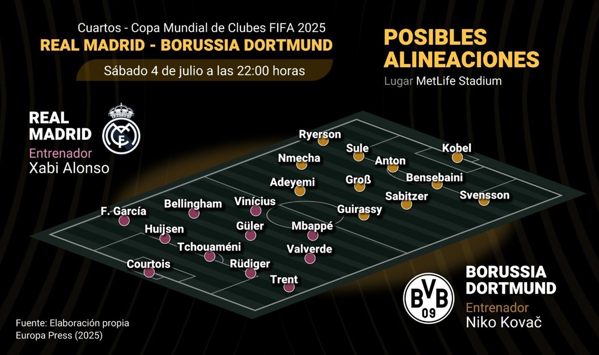El Real Madrid se enfrenta este sábado (22.00 hora peninsular española) al Borussia Dortmund en los cuartos de final del Mundial de Clubes en el Meadowlands Stadium de Nueva Jersey, en la reedición de la final de la Champions 2024 con el deseo de ambos conjunto de ser uno de los cuatro mejores equipos del torneo, un duelo con la gran duda para Xabi Alonso de elegir entre un Gonzalo García en racha y Kylian Mbappé.