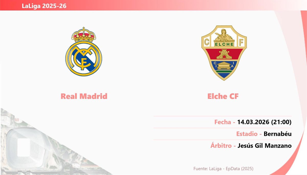 El partido que enfrenta a Real Madrid y Elche de la jornada 28 de LaLiga EA Sports 2025-26 se disputará el sábado 14 de marzo a las 21.00 horas en el Santiago Bernabéu.