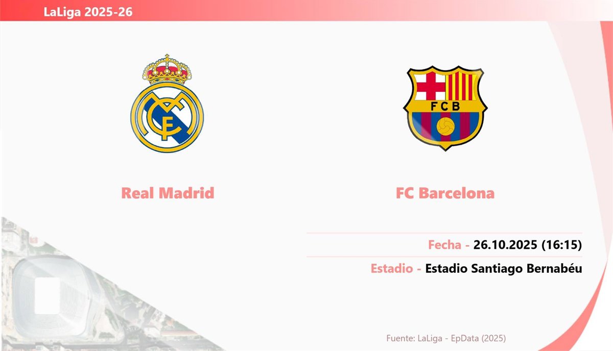 El partido que enfrenta a Real Madrid y FC Barcelona de la jornada 10 de LaLiga EA Sports 2025-26 se disputará el domingo 26 de octubre a las 16.15 horas en el Santiago Bernabéu.