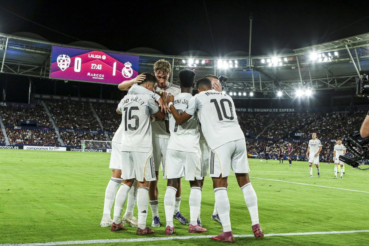 En un Ciutat encendido, el Levante golpeó primero, embotellando al Real Madrid y culminando la primera llegada del duelo, en las botas de Iván Romero, que remató fuera algo forzado. Respondieron rápido los blancos en una jugada algo embarullada que rechazó la defensa 'granota' tras el disparo de Arda Güler, y Franco Mastantuono también probó desde lejos sin suerte.