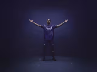 Jude Bellingham posa con la equipación morada del Real Madrid diseñada por 'adidas'