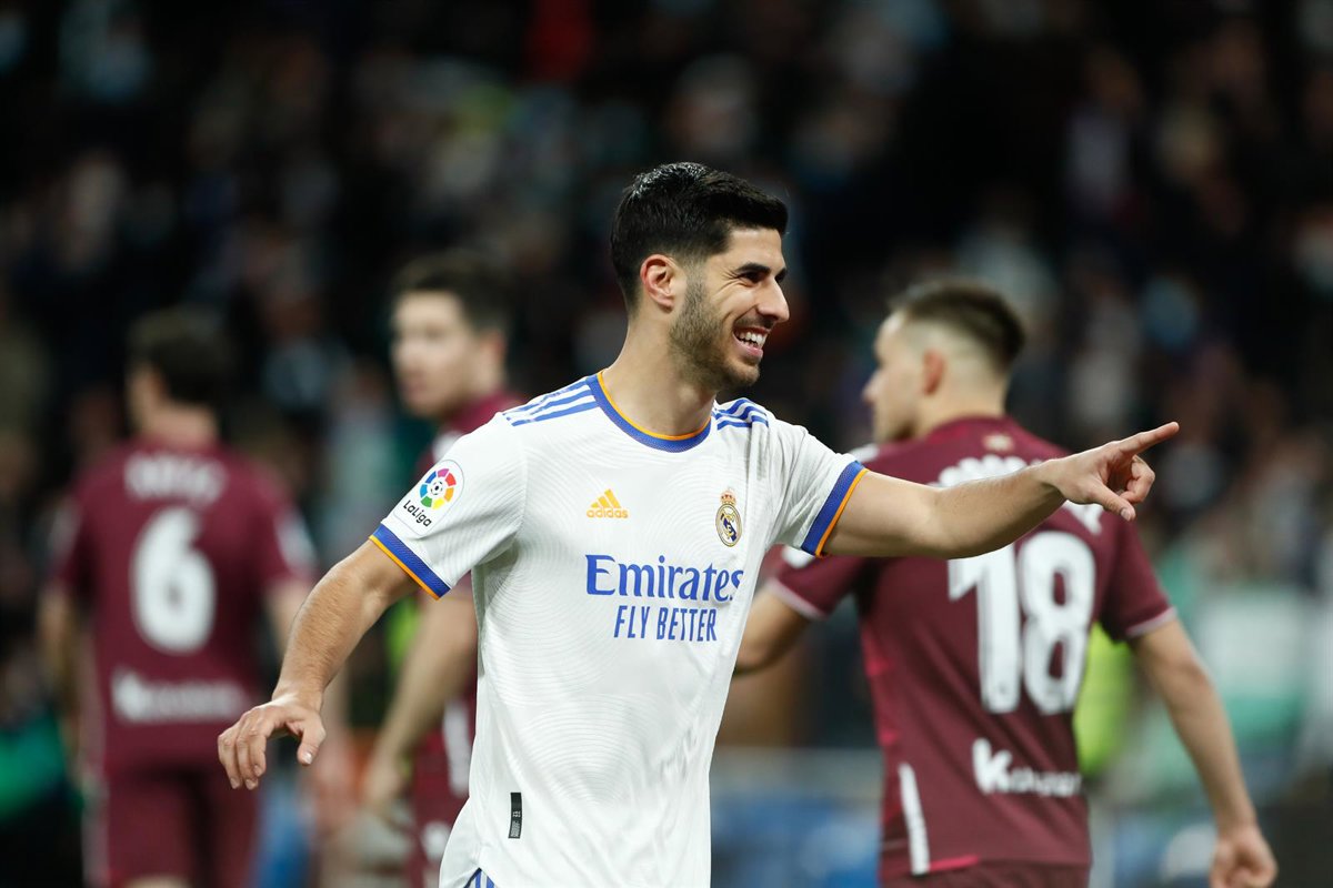 Marco Asensio of Real Madrid celebrates a goal during the spanish league, La Liga Santander, football match played between Real Madrid and Real Sociedad at Santiago Bernabeu stadium on March 05, 2022, in Madrid, Spain. - Oscar J. Barroso / AFP7 / Europa Press