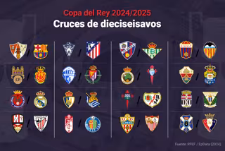 Además, el sorteo ha encuadrado a otros dos equipos de Primera RFEF con dos de Primera División, mientras que otros nueve equipos de LaLiga EA Sports han hecho lo propio ante equipos de la categoría de plata del fútbol español, entre ellos el Racing de Santander, líder de LaLiga Hypermotion, que recibirá al RC Celta. También se vivirá un derbi andaluz entre el Almería y el Sevilla.