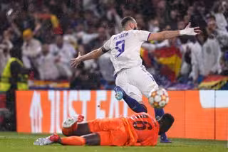 El jugador del Real Madrid Karim Bezema celebra un gol ante el Chelsea en la ida de cuartos de final de la Liga de Campeones 2021-2022. - John Walton/PA Wire/dpa