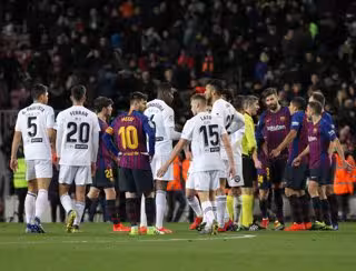 Players of Barcelona and Valencia in action during La Liga Spanish championship, , football match between Barcelona and Valencia, February 02th, in Camp Nou Stadium in Barcelona, Spain. - Irina R. H. / AFP7 - Archivo