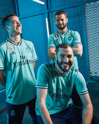 Karim Benzema, Nacho Fernández y Lucas Vázquez con la tercera equipación del Real Madrid 2019-20 - ADIDAS