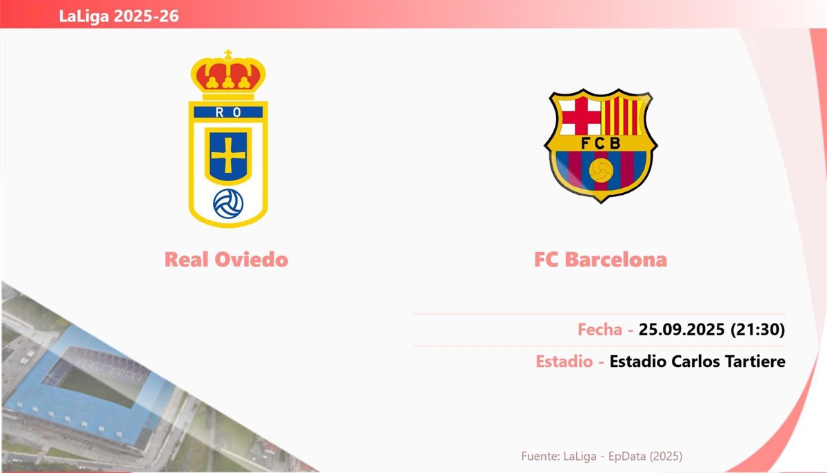 El partido que enfrenta a Real Oviedo y FC Barcelona de la jornada 6 de LaLiga EA Sports 2025-26 se disputará este jueves 25 de septiembre a las 21.30 horas en el estadio Carlos Tartiere.