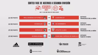 Real Sociedad B-Algeciras, Amorebieta-Badajoz, Burgos-Athletic Club B e Ibiza-UCAM Murcia serán las eliminatorias definitivas del 'Playoff' de ascenso a LaLiga SmartBank, que se disputará en Extremadura, según ha deparado el sorteo celebrado este lunes en el salón de actos de IFEBA en Badajoz.