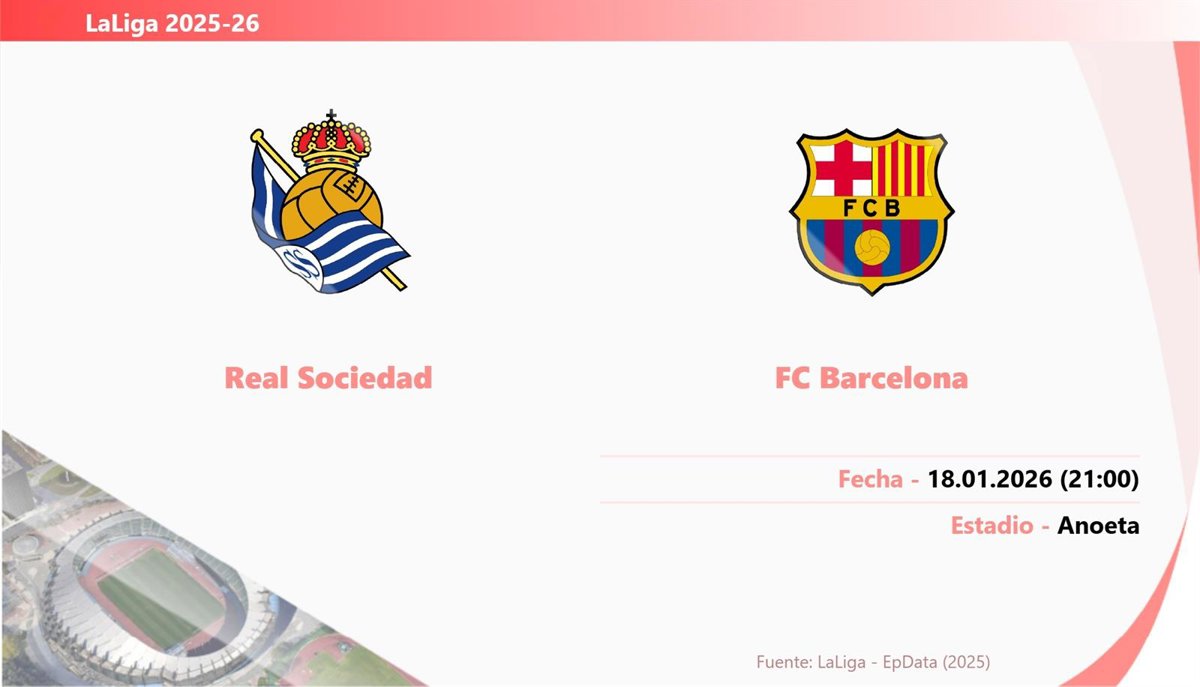El partido que enfrenta a Real Sociedad y FC Barcelona de la jornada 20 de LaLiga EA Sports 2025-26 se disputará el domingo 18 de enero a las 21.00 horas en Anoeta.