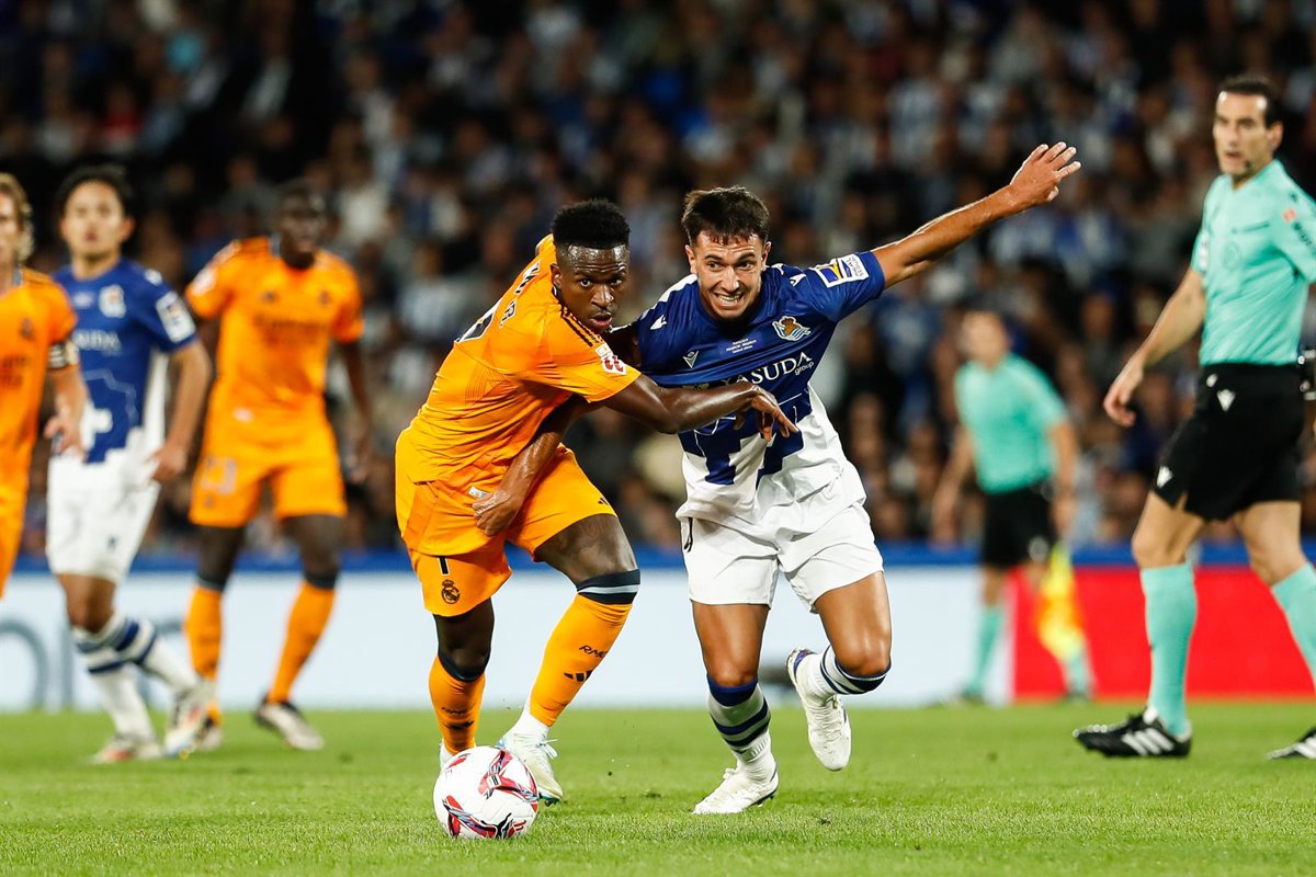Archivo - Vinicius Junior (Real Madrid) y Martin Zubimendi (Real Sociedad) durante una acción en el partido de Liga entre Real Sociedad y Real Madrid. - Irina R. Hipolito / AFP7 / Europa Press - Archivo