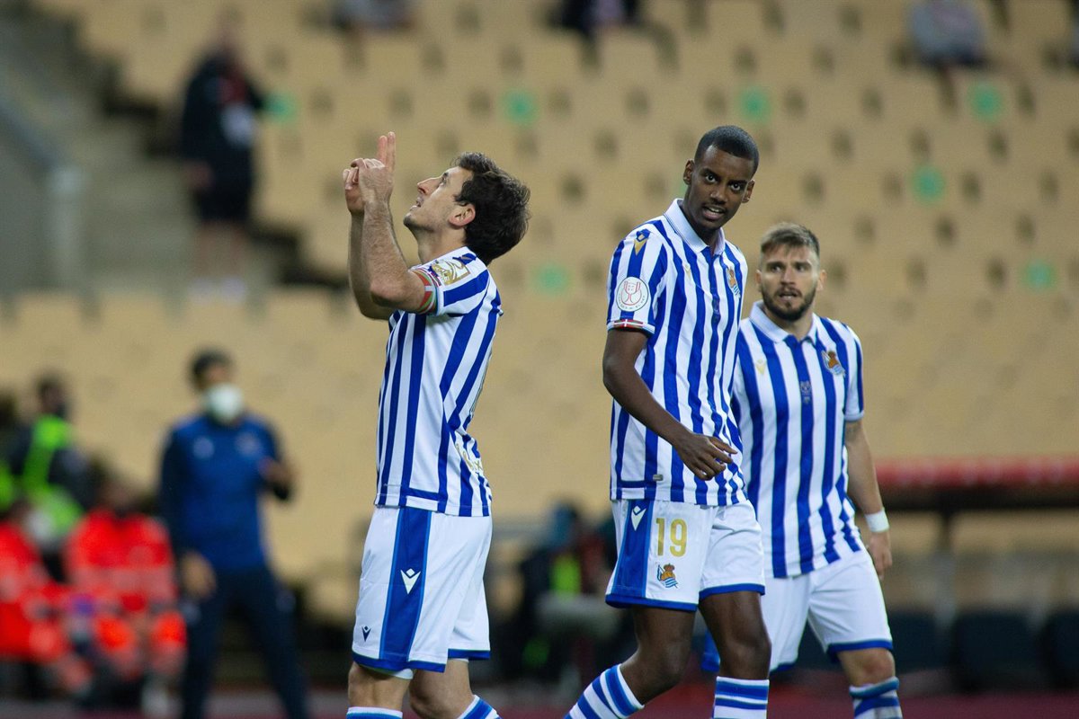Archivo - Mikel Oyarzabal celebra junto a Isak y Portu el gol que dio la Copa del Rey 2020 a la Real Sociedad - Joaquin Corchero / AFP7 / Europa Press - Archivo