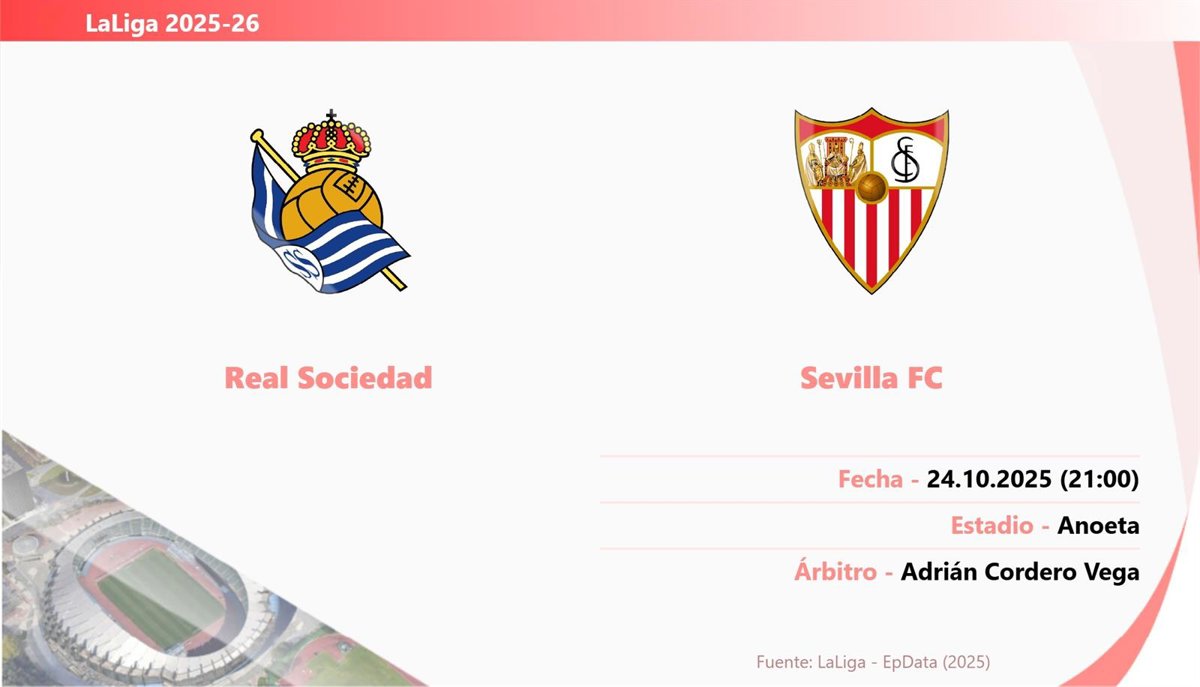 El partido que enfrenta a Real Sociedad y Sevilla de la jornada 10 de LaLiga EA Sports 2025-26 se disputará el viernes 24 de octubre a las 21.00 horas en Anoeta.