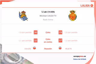 De media, la Real ha recibido 1,1 goles y 9,5 disparos por partido, frente a los 1,2 goles y 8,9 tiros que recibe el Mallorca.