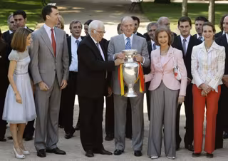 Nada más entrar, Don Juan Carlos comentó divertido al seleccionador nacional, Luis Aragonés: "No tenemos una manta para mantearte".