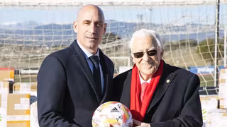 El presidente de la RFEF, Luis Rubiales, junto al fundador de la ONG Mensajeros de la Paz, el Padre Ángel. - RFEF