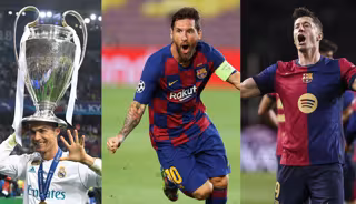 De izquierda a derecha, los máximos goleadores históricos en la Liga de Campeones: Cristiano Ronaldo, Leo Messi y Robert Lewandowski - FCB