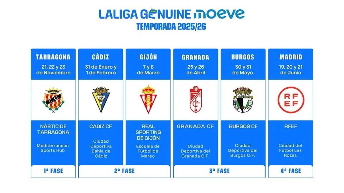 La inauguración tendrá lugar en Tarragona (21, 22 y 23 de noviembre) con el Nàstic como anfitrión y la presencia de los 50 equipos de la competición. La segunda fase tendrá como escenario Cádiz (31 de enero y 1 de febrero) y Gijón (7 y 8 de marzo), mientras que el Granada CF albergará la tercera fase (25 y 26 de abril) junto con el Burgos CF (30 y 31 de mayo), para cerrar el curso en la Ciudad del Fútbol del 19 al 21 de junio de 2026.