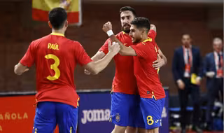 Los jugadores de la selección española de fútbol sala celebran uno de sus goles en uno de los amistosos ante Brasil - PRENSA RFEF