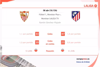 En el apartado ofensivo, el conjunto rojiblanco supera al equipo de Nervión en goles por partido con 1,6 goles por encuentro del primero frente a 1,1 del segundo. En cuanto a la calidad de las ocasiones de gol generadas, el equipo madrileño también supera al andaluz con 1,2 goles esperados frente a 0,9, según las estadísticas de Driblab consultadas por Europa Press.