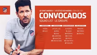 La convocatoria completa de 19 está formada por los porteros Adán y Álex; los defensas Filipe Luis, Arias, Savic, Juanfran, Montero y Carlos Isaac; los centrocampistas Thomas, Lemar, Rodrigo, Gelson, Vitolo, Toni Moya y Joaquín; y los delanteros Kalinic, Correa y Borja Garcés.
