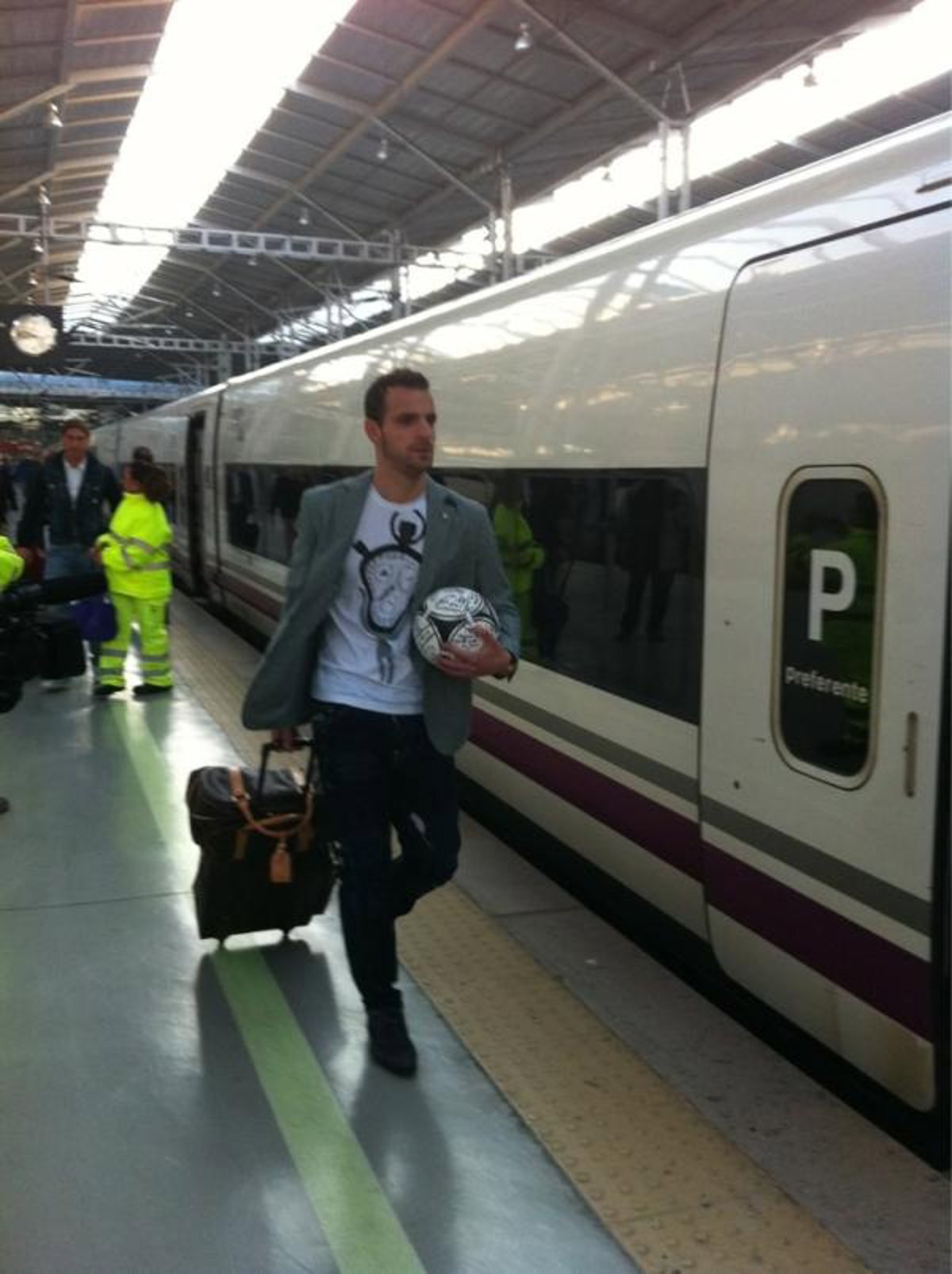 El delantero internacional español Roberto Soldado seguía exultante este jueves a su llegada a la estación de AVE dónde tomó el tren en Málaga de regreso a Valencia tras anotar un 'hat-trick' en la victoria de España ante Venezuela (5-0).